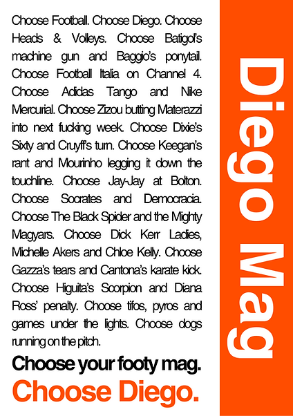 Diego Magazine is a quarterly football & culture magazine founded in 2020, named in honour of the legendary Diego Maradona. Inspired by traditional football fanzines, Diego Magazine is a proudly print publication founded by three football obsessives. We look to celebrate the beautiful game with stories written by the fans, for the fans, collaborating with writers and artists from around the world.”
